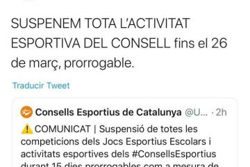Queden anul.lades les competicions i els entrenaments extraescolars esportius per recomanació del Consell Esportiu de Sabadell, fins al 26 de març i prorrogable, com a mesura i prevenció coronavirus.