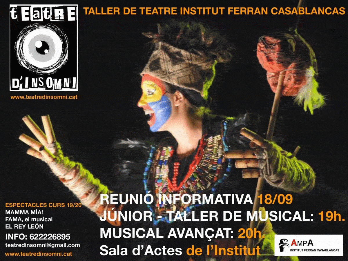 L’extraescolar de teatre, organitzada per l’entitat “Teatre d’Insomni” us informa que la reunió informativa serà el 18 de setembre: